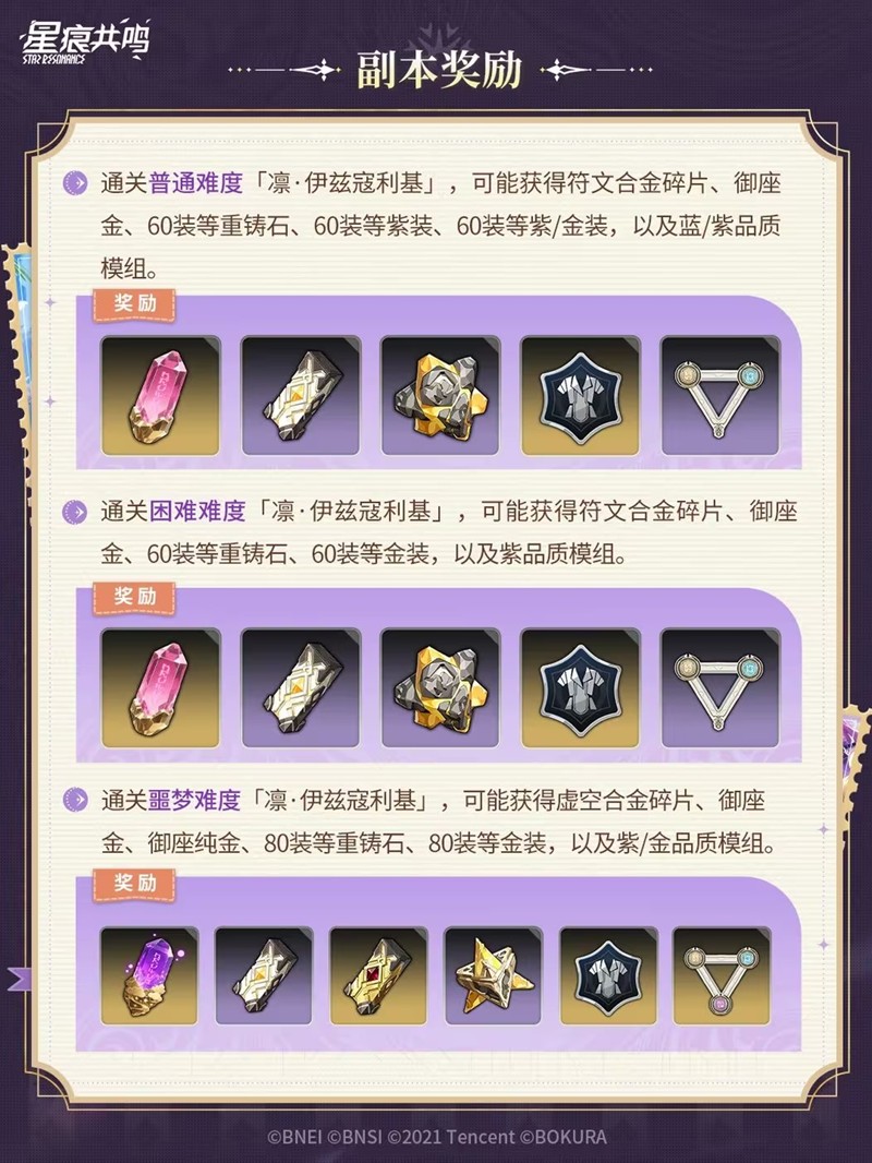3、通關(guān)凜伊茲寇利基可獲符文合金碎片、御座金、60裝等重鑄石、60裝等紫裝及紫金裝、藍(lán)紫品質(zhì)模組,困難獎(jiǎng)勵(lì)升級(jí)60裝等金裝和紫品質(zhì)模組,噩夢(mèng)有虛空合金碎片等更豐厚獎(jiǎng)勵(lì)。