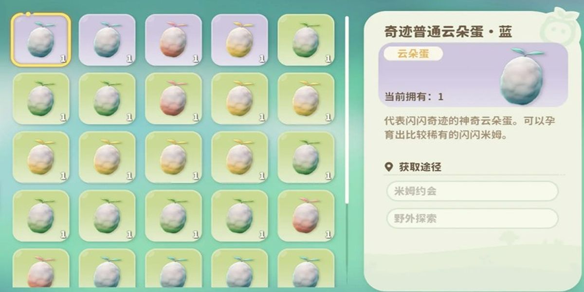 1、角色等級(jí)達(dá)16級(jí)解鎖戀愛帳篷,可以將兩只不同性別米姆放入帳篷中約會(huì),消耗掉三朵蒼翠小花使其產(chǎn)生愛的結(jié)晶,約會(huì)成功獲云朵蛋,此外地圖各區(qū)域會(huì)隨機(jī)刷新野生云朵蛋。
