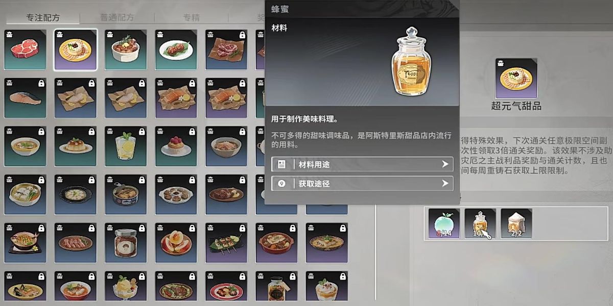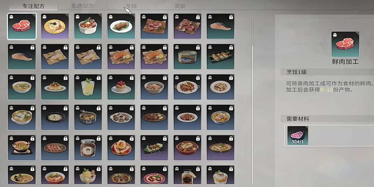 2、烹飪系統(tǒng)采用配方制,需收集解鎖各種料理配方,基礎(chǔ)配方需1到2種食材,高級配方需3到4種食材,配方可通過完成任務探索地圖或與NPC互動獲得,各配方效果不同。