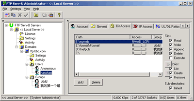 ⑴利用Groups(組)可以預(yù)先建立好一個(gè)或多個(gè)確定了屬性(讀寫等)和控制權(quán)限(授予或禁止某些IP地址訪問(wèn))的目錄,以后當(dāng)我們建立新的用戶,需要用到這些目錄時(shí),就直接添加進(jìn)去就行了,不用再進(jìn)行重復(fù)設(shè)置。在這種情況下,組的建立可以大大減輕設(shè)置工作量。