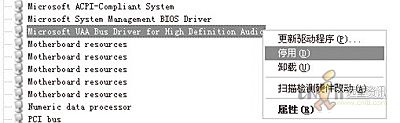 3.進(jìn)入“設(shè)備管理器”,停用“Microsoft UAA Bus Driver for High Definition Audio”,此時該設(shè)備會打黃色感嘆號,然后再右鍵點(diǎn)擊該設(shè)備并選擇“刪除”,就成功刪掉了操作系統(tǒng)自帶的HD Audio總線驅(qū)動。