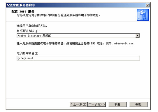 (4)單擊“下一步”按鈕,打開如圖所示對(duì)話框。在其中要求選擇郵件服務(wù)器中所使用的用戶身份驗(yàn)證方法,一般如果是在域網(wǎng)絡(luò)中,選擇“Active Directory集成的”這種方式,這樣郵件服務(wù)器就會(huì)以用戶的域帳戶進(jìn)行身份認(rèn)證。然后在“電子郵件域名”中指定一個(gè)郵件服務(wù)器名,本示例為grfwgz.mail。