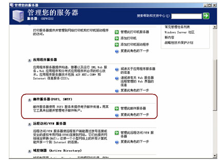 (7)完成文件復(fù)制后系統(tǒng)會(huì)自動(dòng)打開如圖49所示向?qū)瓿蓪?duì)話框。直接單擊“完成”按鈕完成郵件服務(wù)器的整個(gè)安裝過程。完成后執(zhí)行【開始】→【管理工具】→【管理您的服務(wù)器】菜單操作,在打開的如圖50所示“管理您的服務(wù)器”窗口即可見到剛才安裝的郵件服務(wù)器了。單擊“管理此郵件服務(wù)器”即可打開郵件服務(wù)器窗口,如圖所示。