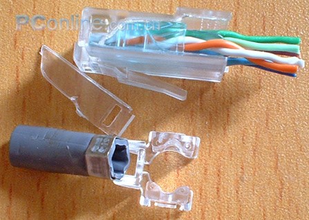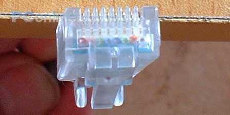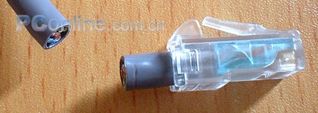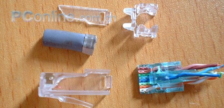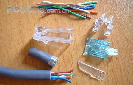 首先,雙絞線從分線器的后部穿入,在十字形的導(dǎo)入口就按照線對分開了,白、橙入左孔;淺藍(lán)、深藍(lán)入上孔;淺綠、深綠入下孔;淺棕、深棕入右孔。到前端后按照白、橙、淺綠、深藍(lán)、淺藍(lán)、深綠、淺棕、深棕的順序被排好,線頭與前端對其后就可以插入RJ45水晶頭的外殼了。這個是一個不錯的改進(jìn),一下就把原來那種又掰又捏又捅的別扭工序摒棄了。而且線芯只有到了頂端才變成平面的排列,在整個接頭的80%的區(qū)域仍然保持著雙絞和圓形的狀態(tài),這明顯比原來的百兆接頭強(qiáng)多了。不光是制作工序上,在傳輸效率上也是比較大的改進(jìn)。(這么多怪怪的零件,看來原來的RJ45壓線鉗是對它束手無策了)