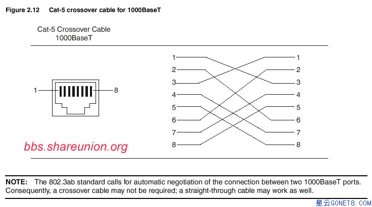千兆5類或超5類雙絞線的形式與百兆網(wǎng)線的形式相同,也分為直通和交叉兩種。直通網(wǎng)線與我們平時所使用的沒有什么差別,都是一一對應(yīng)的。但是傳統(tǒng)的百兆網(wǎng)絡(luò)只用到4 根線纜來傳輸,而千兆網(wǎng)絡(luò)要用到8 根來傳輸,所以千兆交叉網(wǎng)線的制作與百兆不同,制作方法如下:1對3,2對6,3對1,4對7,5對8,6對2,7對4,8對5