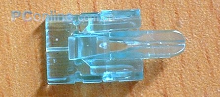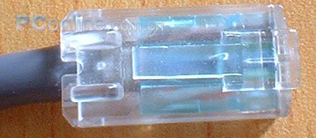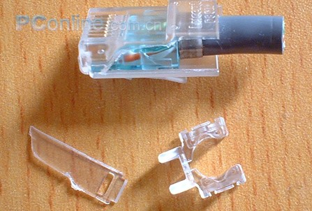 這是側(cè)面,靠近根部明顯得的多了兩個三角形的護(hù)片,是防止不小心弄斷前面的定位壓片用的。大家應(yīng)該有經(jīng)驗(yàn),原來百兆的水晶頭最愛壞的也就是定位壓片。百兆水晶頭由于定位壓片經(jīng)常掛住雜物而造成折斷,布線中從傳線孔內(nèi)拉出時也是“九死一生”。有了這個簡單的設(shè)計,可以大大延長水晶頭的壽命。