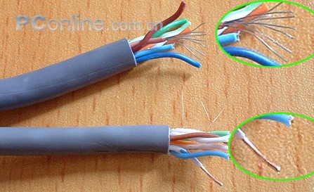 再把網(wǎng)線芯導(dǎo)線的線皮剝掉,看到不一樣了吧。普通百兆線是單一根銅絲,而千兆線是每芯里面還有7根鍍銀線。明顯的,傳輸效率也就高了,而且在日常的使用中,更不易折斷。