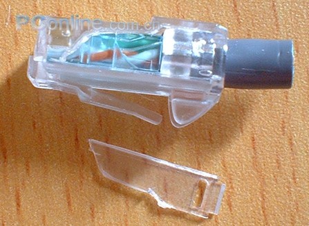 下面再來分析網(wǎng)頭,從透明的部位看,是多層的結(jié)構(gòu),現(xiàn)在,我們要開始給它動手術(shù)了。我用小刀把一側(cè)的塑料片切下來,里面果然還有幾層。側(cè)面切下來的塑料片上有一個長條形的孔,是為了固定水晶頭后部的卡線器的,同樣的,在對稱的那邊也有相同的孔。