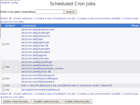 讓我們看一下如何通過Webmin管理時(shí)鐘守護(hù)任務(wù)。登錄并且點(diǎn)擊側(cè)邊欄“系統(tǒng)(System)”下的“調(diào)度時(shí)鐘守護(hù)任務(wù)(Scheduled Cron Jobs)”。你就可以看到系統(tǒng)中所有的時(shí)鐘守護(hù)任務(wù)列表,你可以將選定的任務(wù)設(shè)置為啟用/禁用,或者刪除/添加任務(wù)以及其他列出的功能。
